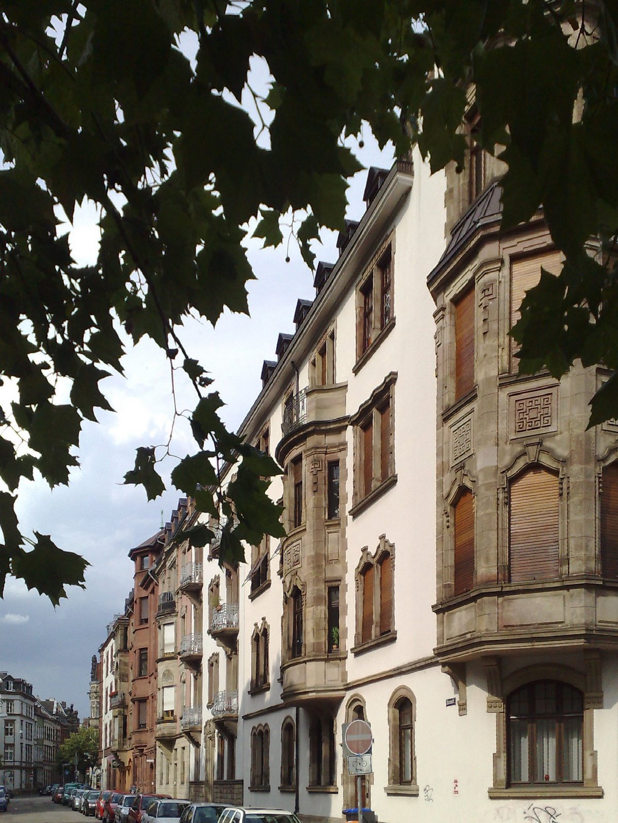 Although English towns rarely have them, three to five story apartment buildings dating back to the end of the 1900s are a common feature in the centre of many European and North American cities. In Edinburgh or Glasgow, they would be called tenements. This photo is an attractive example of Saarbrücken's variation on this theme. It is in a fashionable area, a few metres away from the art gallery with the big metal tentacle.